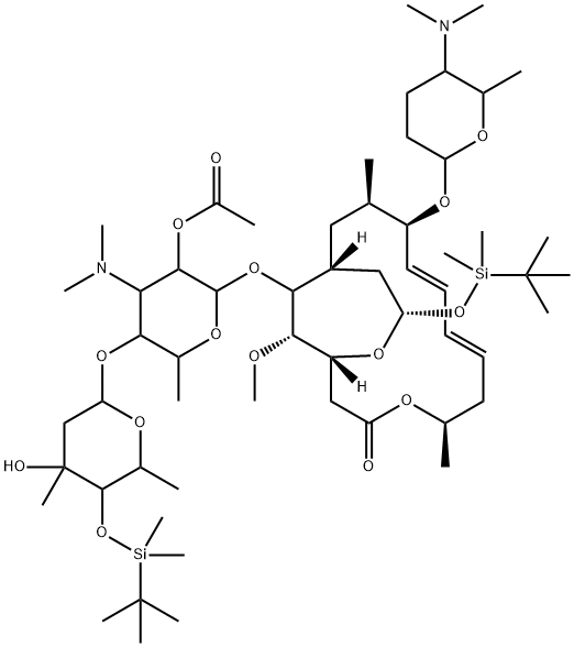 Leucomycin V,18-deoxo-3-deoxy-4B-O-[(1,1-dimethylethyl)dimethylsilyl]-18-[[(1,1-dimethylethyl)dimethylsilyl]oxy]-3,18-epoxy-9-O-[tetrahydro-6-methyl-5-(methylamino)-2H-pyran-2-yl]-,2B-acetate, [9(2R,5S,6R)]- (9CI)